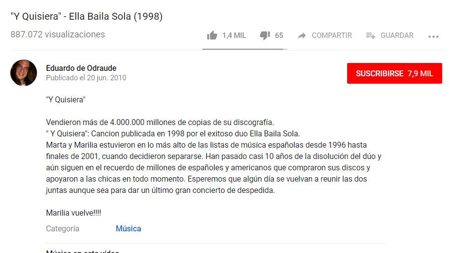 Ella Baila Sola es un dúo musical que tuvo como formación original desde 1996 hasta finales de 2001 a Marilia Andrés y a Marta Botía. Pues bien, no voy a contar nada que no se sepa sobre este TEMAZO. Pero analizaremos la descripción del vídeo porque es ORO.